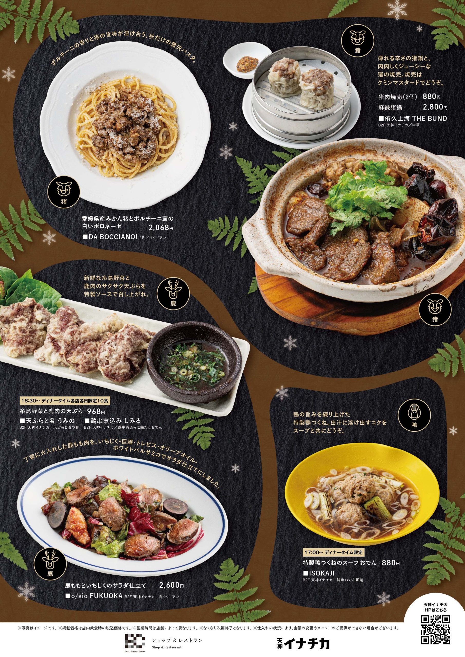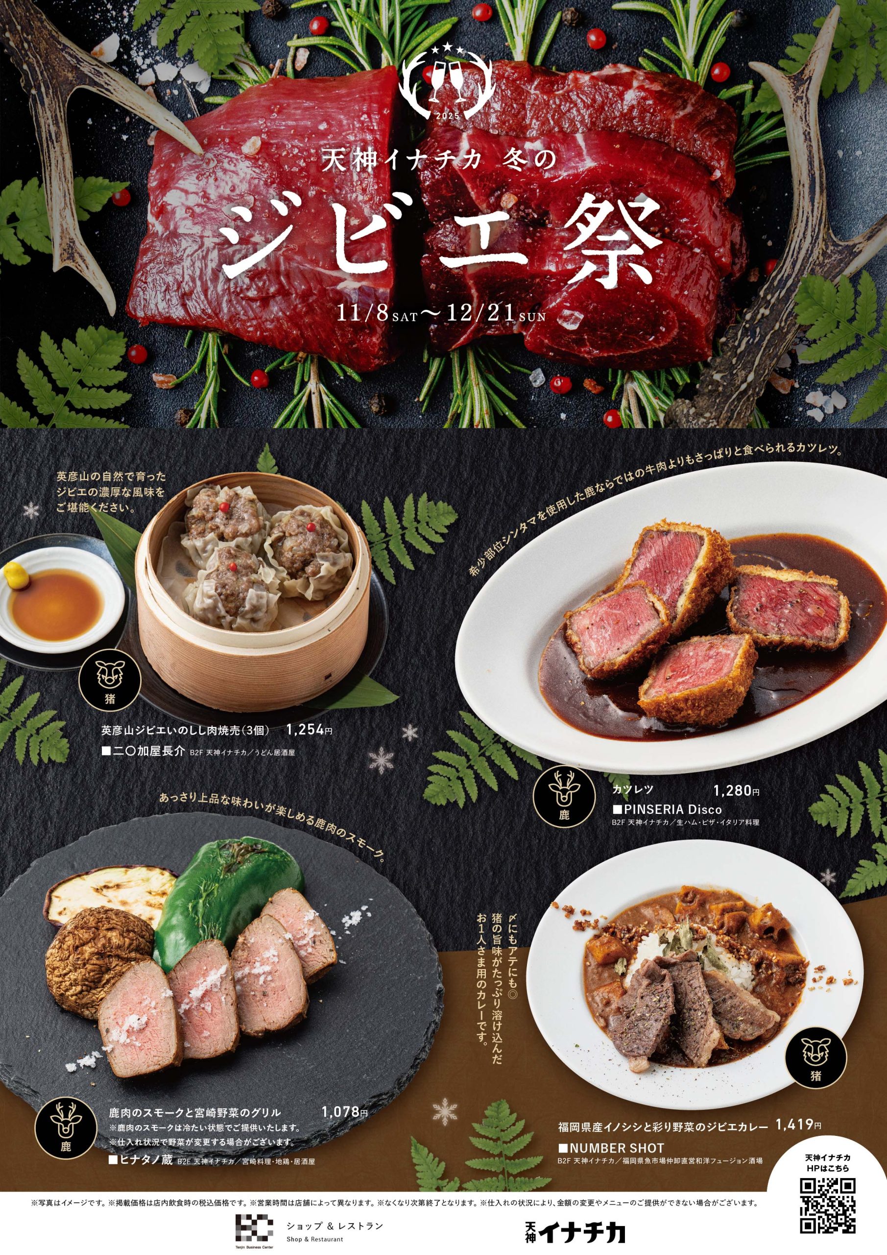 深まる秋冬、天神イナチカに“森のごちそう”がやってきます。鹿や猪など、自然の中で育まれた恵みをいただくジビエ料理。その一皿には、森の静けさと野生の力強さが宿ります。都会の喧騒を離れ、森の中に迷い込んだようなひとときを、天神イナチカでお楽しみください。
